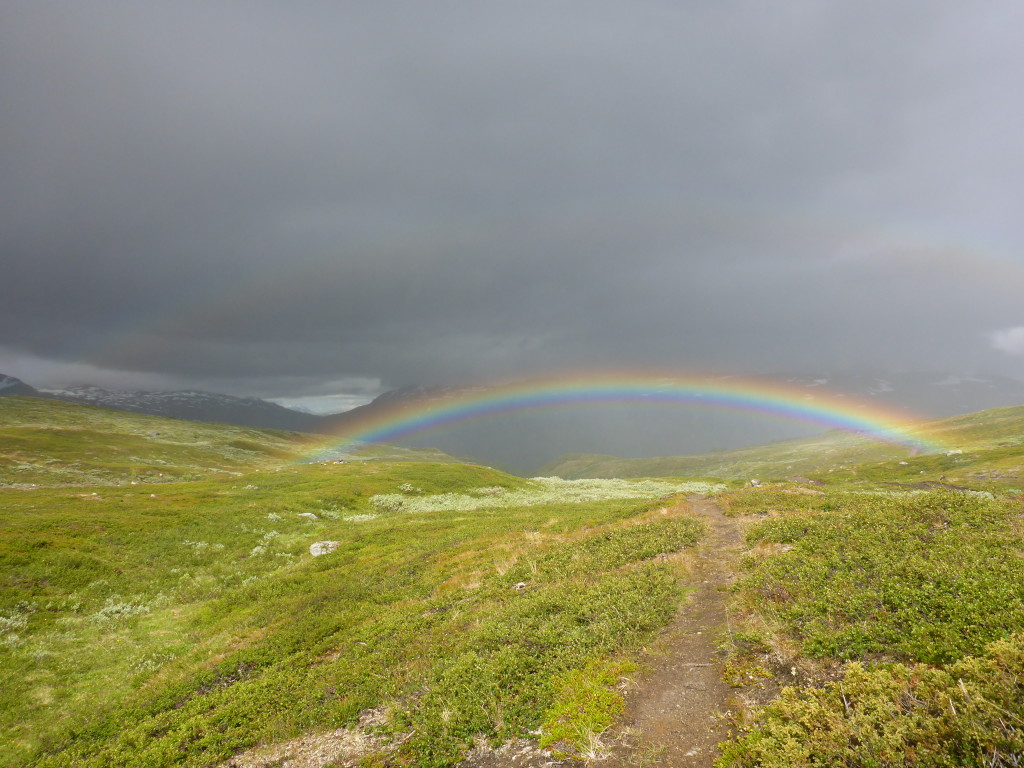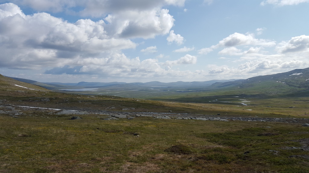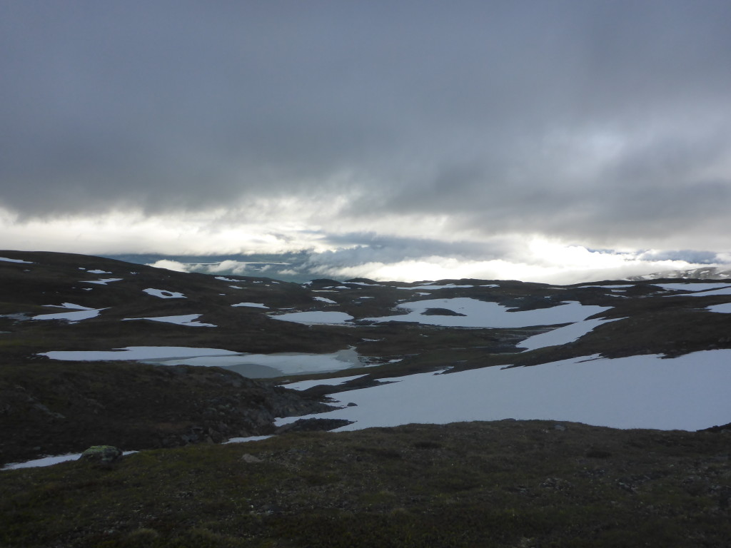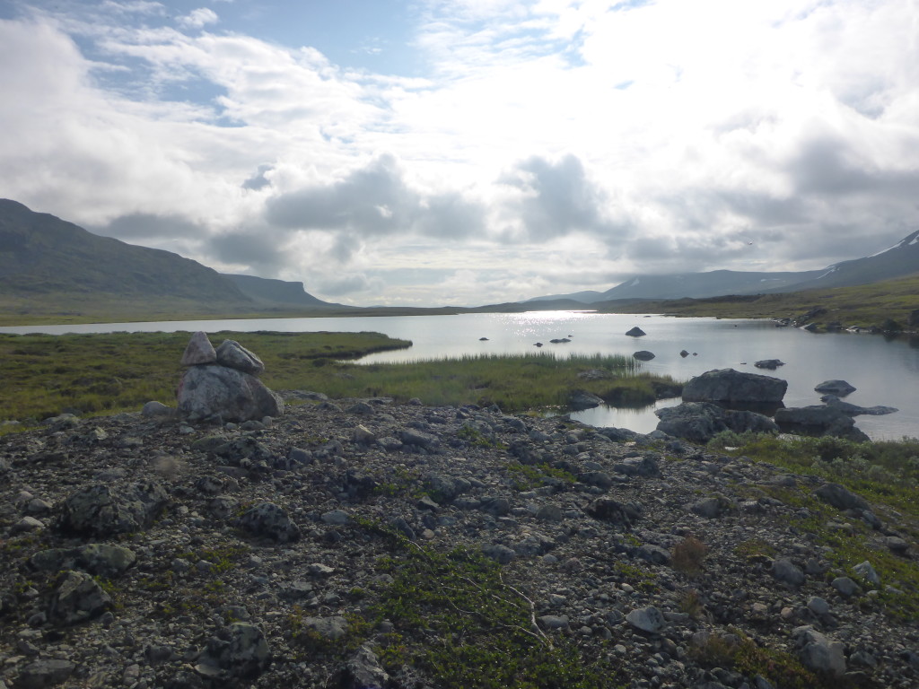 Ich bin ziemlich fit und die Strecke heute gefällt mir besonders gut. Meine Schuhe sind zwar immer noch nass, doch wenn ich alle paar Stunden trockene Socken anziehe, schmerzen meine Füsse nicht so sehr. Gegen Mittag erreiche ich bereits die Gasskasshytta. Ich mache eine kurze Mittagspause und beschliesse dann, nochmal eine Etappe in Angriff zu nehmen. Mein Ziel ist die Altevasshytta, wenn ich diese erreiche, habe ich ziemlich genau 30 Km gewandert.