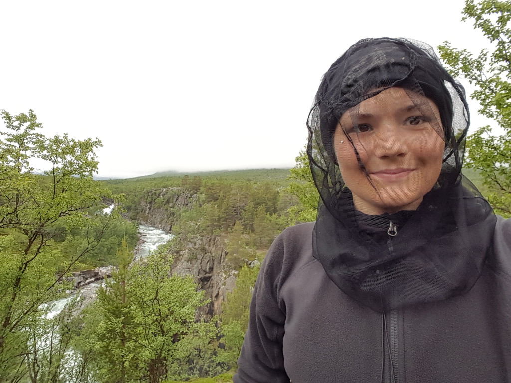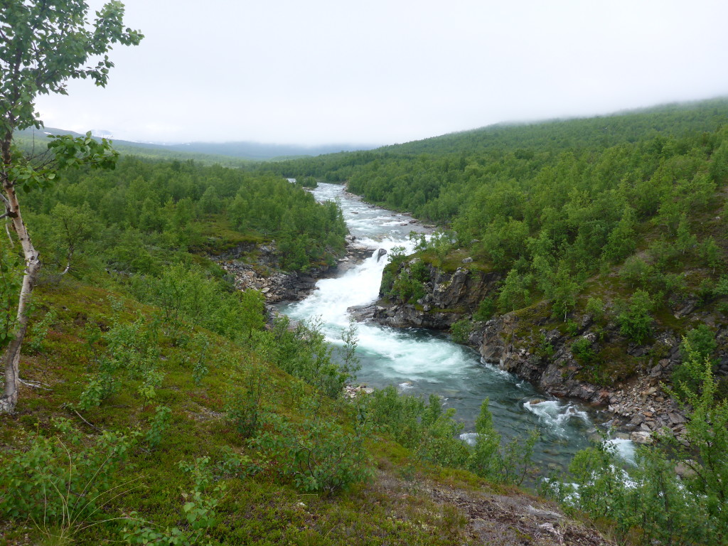 Der Weg ist streng. Ich bin nun im Dividals-Nationalpark, eine wunderschöne Gegend mit viel Wald und entlang einem breiten Fluss. Das Wetter ist wieder besser und der sanfte Wind hält mir alle Mücken vom Leib. So ist es schön zu wandern!