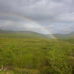 Je höher ich steige, dessdo mehr zerrt der Wind an mir. Trotz meiner Regenkleider bin ich schon wieder nass. Ein Blick zurück lohnt sich aber, denn die Sonne zaubert einen wunderschönen Regenbogen in die graue Wand hinter mir.
