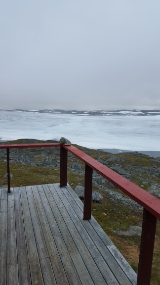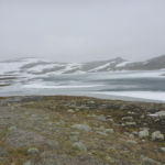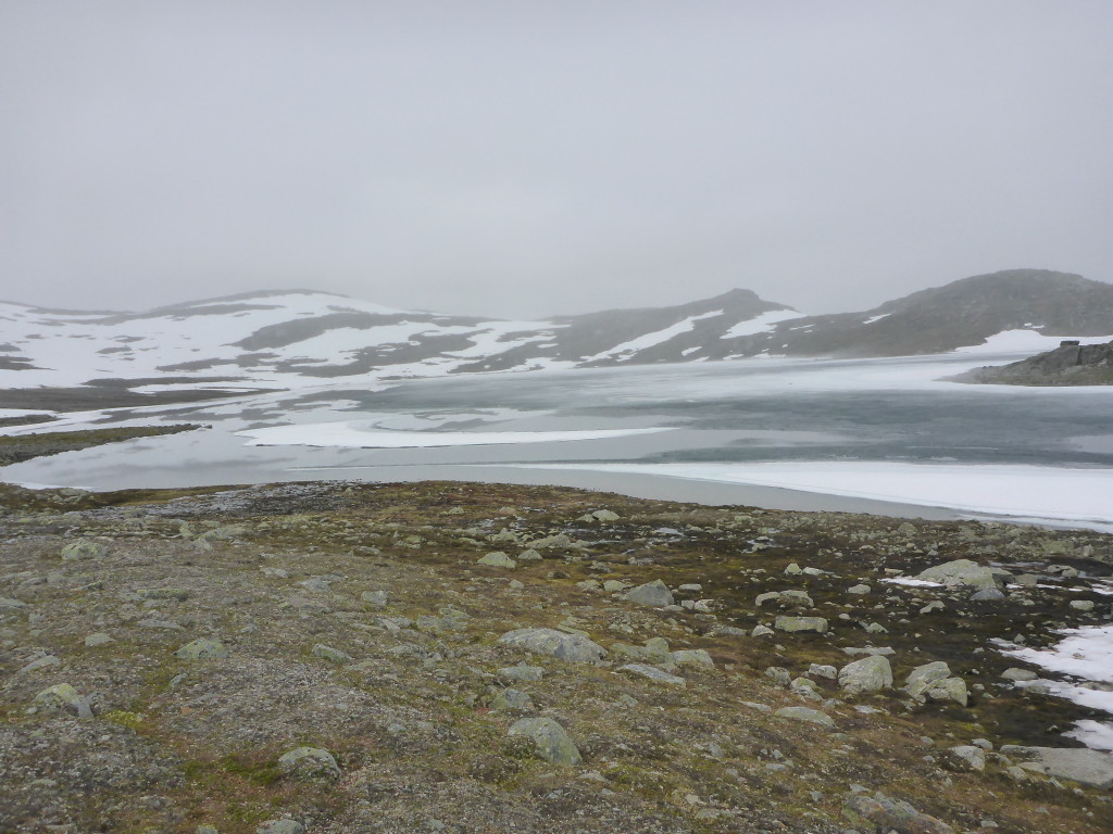 Plötzlich taucht im Nebel die Skoaddejávre Hütte auf. Sie liegt an einem See, der noch fast komplett zugefrohren ist. Wir haben August! Auch heute werde ich wieder in der Hütte übernachten. Es ist doch viel bequemer in einem richtigen Bett.