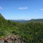 Zum ersten Mal seit Langem komme ich wieder unter die Baumgrenze. Ich mache mich auf die schlimmste Mückenplage gefasst, doch erstaunlicherweise hat es gar nicht so viele Mücken. Es ist wohl sogar den Mücken zu heiss heute, wir haben immerhin 25 Grad im Schatten! (Gemäss Thermometer bei der Njunjes Fjällstuga) Auch mir läuft der Schweiss immer wieder in die Augen, was ziemlich brennt. Ab jedem noch so kleinen Wasserrinnsal freue ich mich.