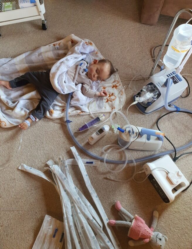 Im Juli 2022 fing sich Emma dann plötzlich einen Virus ein. Eines Morgens wachte sie auf und konnte nicht mehr aufhören zu husten. Unsere Geräte gaben das Maximum an möglichem Sauerstoff her und trotzdem war es nicht genug. Wir mussten ins Krankenhaus. Nach 5 Tagen wollten die Ärzte uns ein weiteres Kind mit einem anderen Virus ins Zimmer bringen. Ich intervenierte so lange, bis wir entlassen wurden. Emma war ganze 3 Wochen krank und ich blieb mit ihr Zuhause.